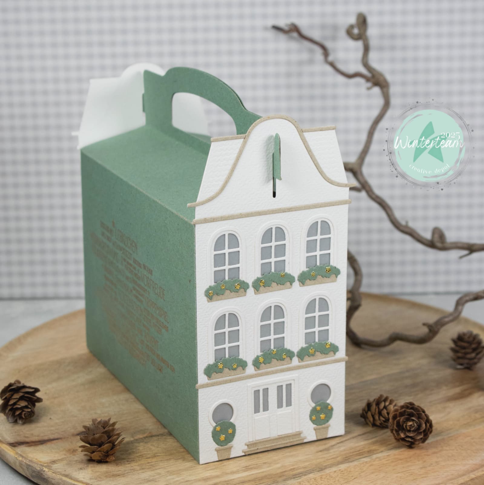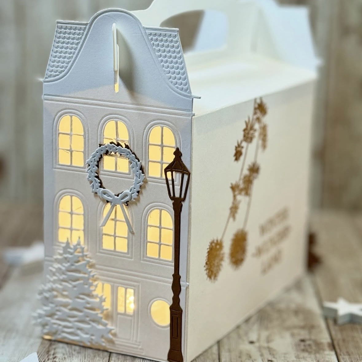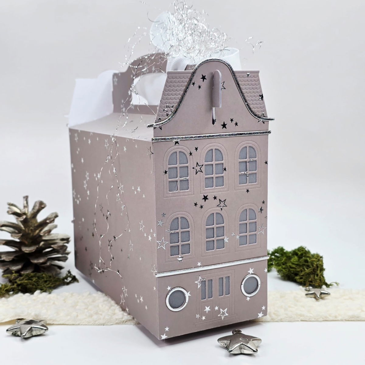 Cette boîte allie architecture et créativité : de fins détails de fenêtre, un charmant toit et une ouverture pratique pour la poignée en font un véritable point fort parmi les boîtes cadeaux.